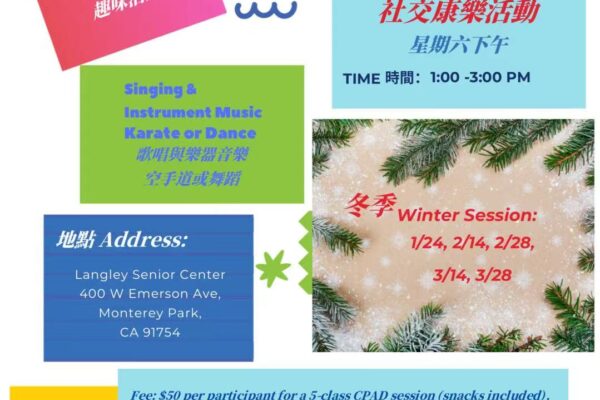 Dear members and parents! Chinese Parents Associations for the Disabled Presents WINTERSESSIONS: Date 1/24, 2/14, 2/28, 3/14 and 3/28/2026 Class Time 上課時段 每個月第二和第四個星期六 Every 2nd and 4th Saturday of the Month 1:00 pm – 2:00 pm 歌唱與樂器音樂 Singing & Instrument...