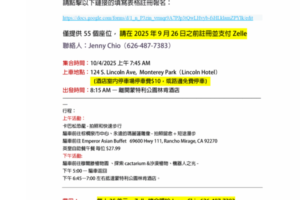 Dear All, 10月4日CPAD舉辦的棕櫚泉一日遊,詳情已在附件上說明。有興趣參加此活動的家庭,請盡快在9月26日之前註冊並報名繳費。 請填寫以下鏈接的表格註冊報名: To register, please fill out the form at this link below: https://docs.google.com/forms/d/1_n_P3zin_vrmqr9A7PJp3tQwLHvyb-fsHLklamZPYlk/edit 每人 35 美元。 Zelle 總金額給 Jenny Chio 626-487-7383 $35 per person. Zelle total amount to Jenny Chio 626-487-7383 CPAD 華裔殘障者家長協會