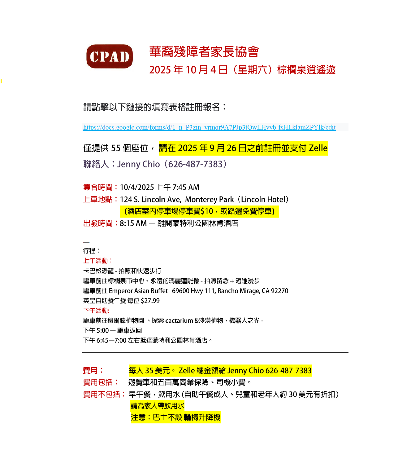 10月4日CPAD舉辦的棕櫚泉一日遊,詳情已在附件上說明。 有興趣參加此活動的家庭, 請盡快在9月26日之前註冊並報名繳費。
